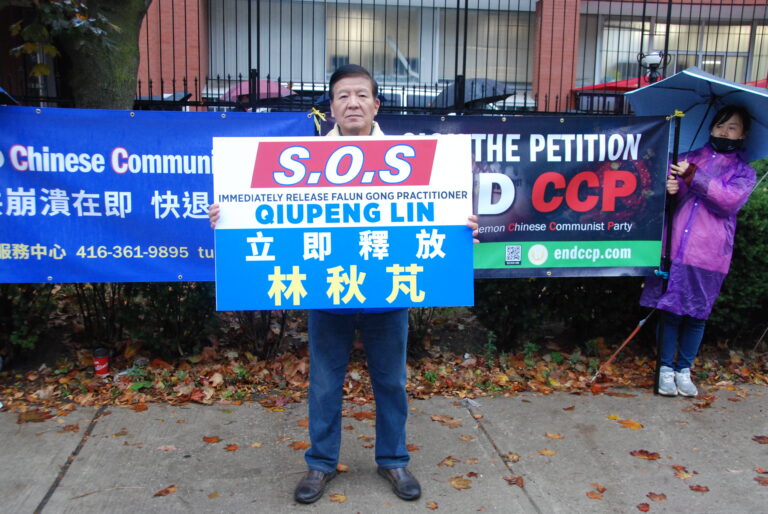 在汽车游行启动的同时,多伦多法轮功学员林慎利在中领馆前举行新闻发布会,要求中共无条件释放他的姐姐林秋芃,并呼吁中共司法人员停止迫害法轮功,认清局势,悬崖勒马,“三:退.”自救。