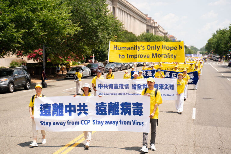 2021年7月16日美国部分法轮功学员在华盛顿DC举行反迫害游行。(戴兵/全球
