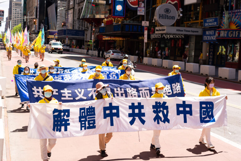 2021年5月13日,部分法轮功学员在纽约曼哈顿举行反迫害游行,声援中国民众退出中共。(戴兵/全球.退:!服务中心)