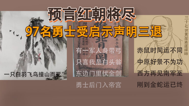 在9月7日的三:退.声明中,有一份包含:13位中共党员、70位共青团和14位少先队等共97人的联合声明,竟然引用了《黄檗禅师诗》。原来他们发现黄檗禅师早在唐武宗会昌年间所留下的14首预言诗,前12首已经全部应验。其中第12首讲的是从明亡到民国、两岸分治,预言准确无误。第13首关于中共的预言,前3句已被证实,相信最后的第4句应验的可能性也很大。最后一首是结语,没有实质内容。