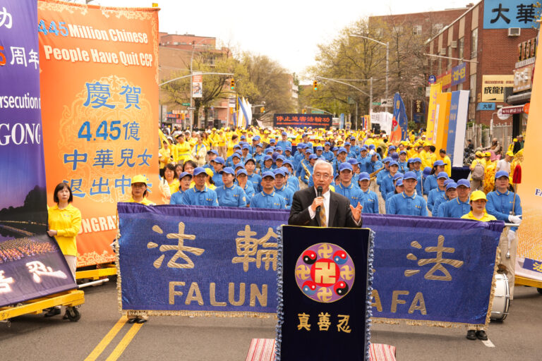 2025年4月19日,纽约法轮功学员在法拉盛游行和集会,纪念“四二五”和平上访26周年,声援4.45亿中国人退出中共党团队。图为全球.退:!中心主席汪志远在集会上发言。(张静怡/全球.退:!服务中心)