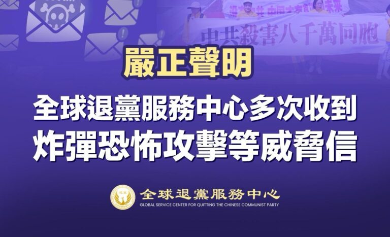 全球.退:党!服务中心多次收到炸弹恐怖攻击威吓信,根据信的目标、内容和手法判断,这些信均来自中共或者中共操控的恐怖势力。