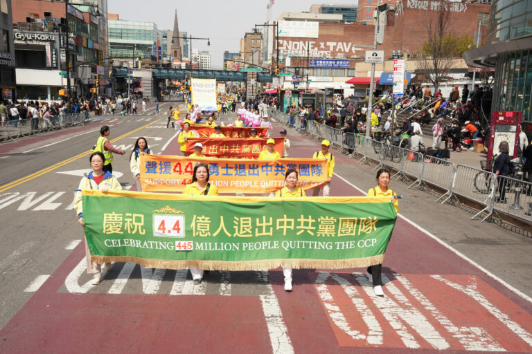 2025年4月19日,部分法轮功学员在美国纽约法拉盛的游行活动中,向过往民众展现法轮大法的美好,并呼吁海外华人退出中共相关组织。(戴兵/全球.退:!服务中心)