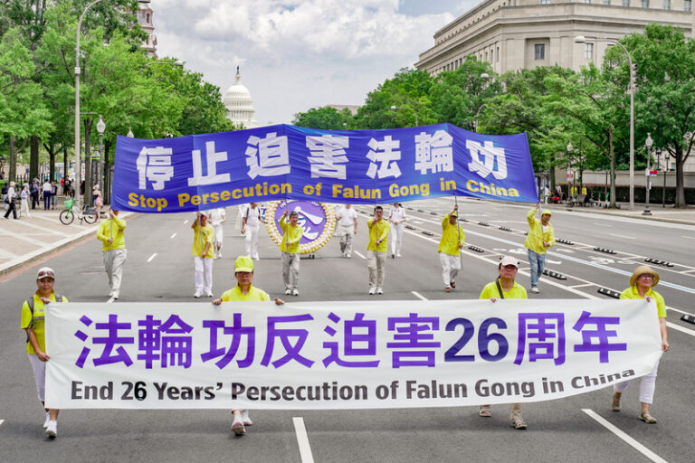 在法轮功反迫害26周年之际,2025年7月17日,来自美国东部地区的部分法轮功学员与支持者在华盛顿DC举行盛大游行,呼吁“解体中共,停止迫害法轮功”。(张静怡/大.纪.元;)