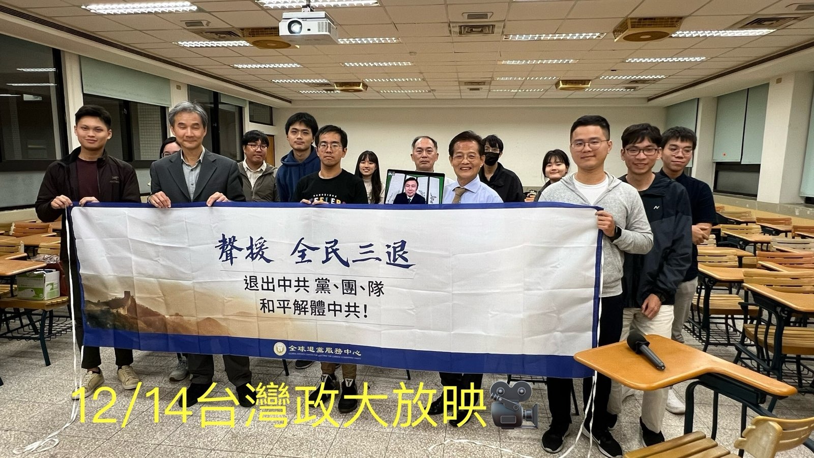 【公民记者小欧/台北报导】为让国立政治大学师生对于中共的本质以及三:退.运动精神能有更深入的了解,政大法轮大法社于12月14日晚间举行了“纪录片《四亿人的觉醒》放映暨座谈会”,并邀请该片导演李军作为映后与谈人(远端连线),也邀请到“追.查!国际组织”台湾分会秘书长管建忠,以及台湾营救协会理事长许凯雄,担任与