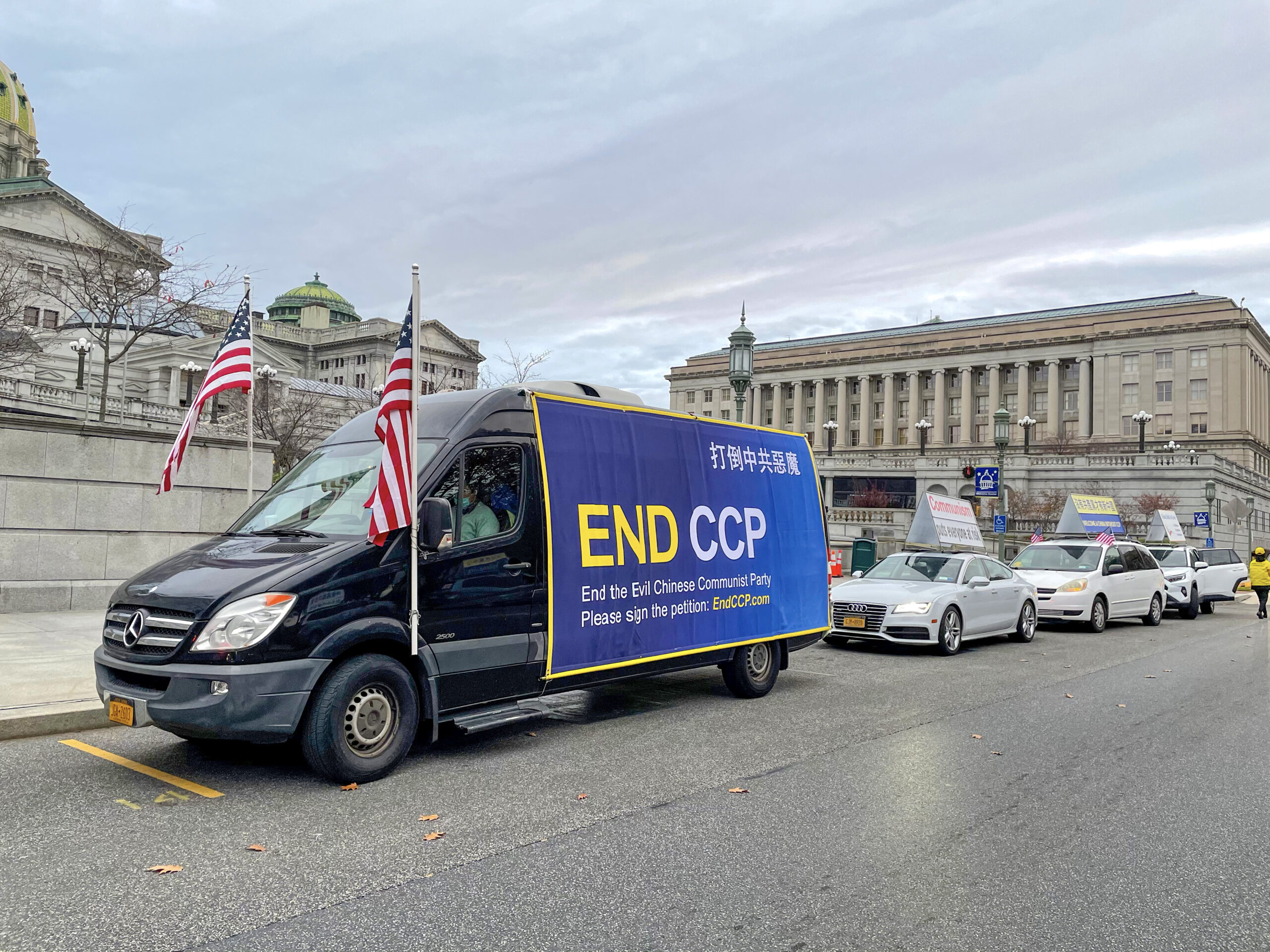 11月21日(周六),全球.退:党!服务中心组织真相车队在美国宾夕法尼亚州首府哈里斯堡游行。 纽约、费城以及哈里斯堡共有42辆车及80多位退!党!义工参与此次活动。 在真相车队经过宾州议会大厦前门和最高法院正门时,退!党!义工也沿街向民众讲述中共在历史上犯下的罪行,以及结束中共的重大意义。 真相车队所到之处,无不