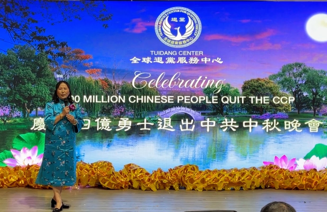 9月5日,全球.退:党!服务中心在纽约法拉盛举办了一场庆祝四亿人退出中共党、团、队的中秋晚会,中心主席易蓉代表晚宴的主办方,首先上台致词,她表示非常高兴看到来了这么多支持中国人退出共产党的朋友,这表明退!党!运动“越来越深入人心”。易蓉向全球各地的退!党!义工特别是中国大陆的法轮功学员表示感谢。 易蓉说,“4亿人
