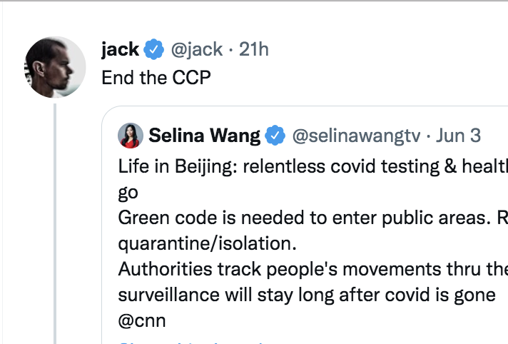 8月6日,推特创始人、前首席执行官杰克‧多西(Jack Dorsey)转推了有关北京严酷“清零”的采访视频,然后发帖说 “End the CCP (结束中国共产党)”。第二天他的帖子得到至少九千多次转发,四万七千人点赞点赞还有几千条评论。 他转推的是CNN驻北京记者王诗琳(Selina Wang)制