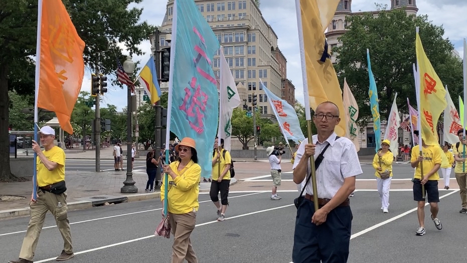 在7月21日美国首都华盛顿DC举行的反迫害23年暨声援4亿中国人退出中共党团队的大游行中,有一位刚从中国大陆来美国才两个月的中国人,举着“·九·评*”的旗帜走在游行队伍中。 他说,来到美国后,终于摆脱了生活在中共统治下的恐惧感,他抵美10天就在退!党!中心办理了退!党!手续,现在又赶上三:退.人数达4亿这个大喜的日子