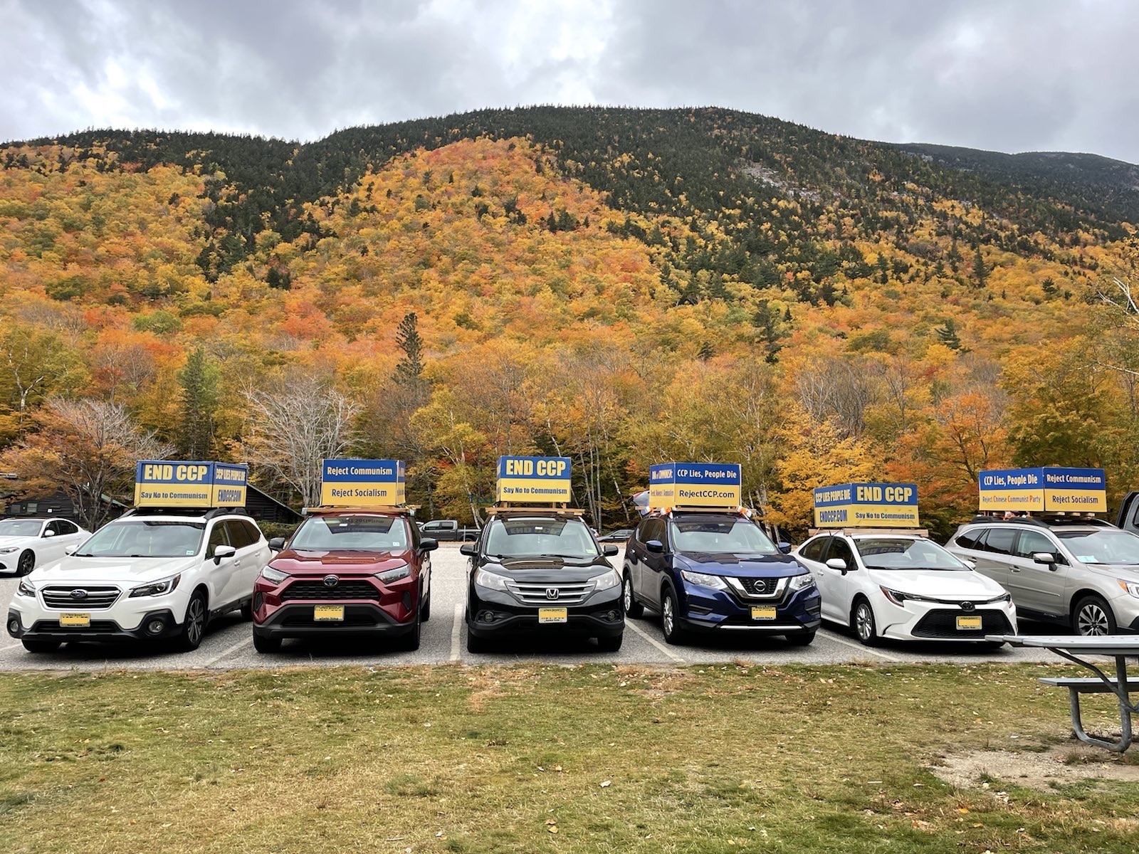 10月8日及9日,新泽西 “打倒中共恶魔” 真相车队,从新泽西出发,经过新泽西州,纽约州,维蒙特州,新罕布什尔州,麻州,康州等六州,车游至新罕布什尔州白山国家森林,沿着观景之路两次横穿白山, 行程近900 英里。 真相车队每辆车顶都安装着标语展板,揭露中共祸国殃民以及共产主义的邪恶本质,如 “End