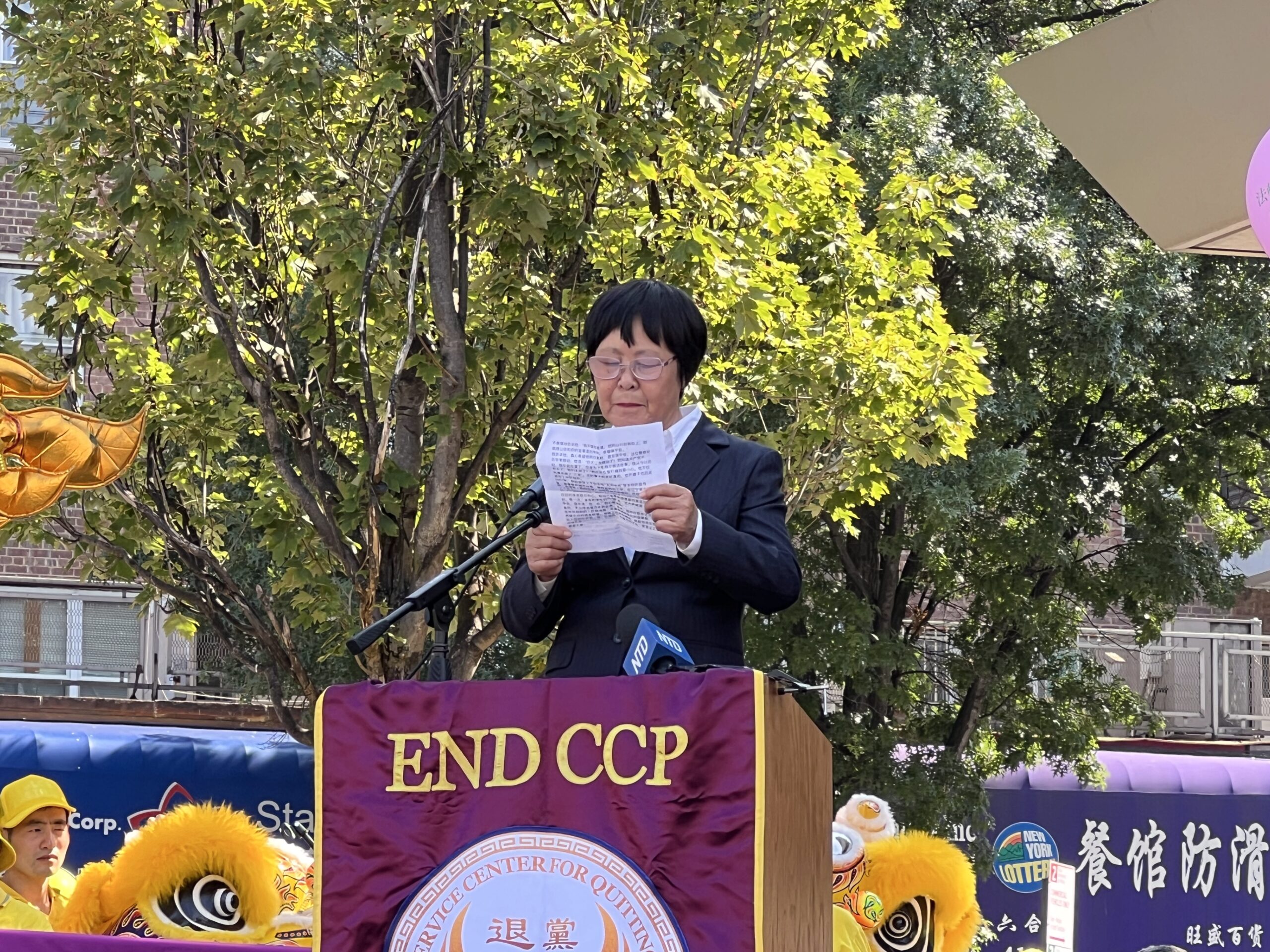 8月10日(周日)上午,全球退出中共服务中心在纽约法拉盛举行集会,庆祝全球退出中共党、团、队(简称“三:退.”)的人数突破了4.5亿人暨“打倒中共恶魔”连署近500万。三:退.义工代表李殿琴在集会上发言。全文如下: 各位来宾,各位朋友,大家好! 我叫李殿琴,今年75岁。来自中国辽宁沈阳。我的家人在中国共产党