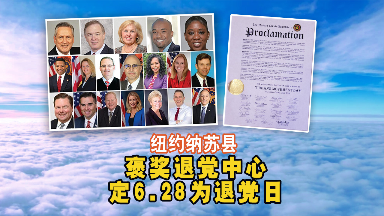 “七一退!党!日”将至,纽约长岛纳苏县立法机构(Nassau County Legislature)全体成员向“全球退出中共服务中心”颁发褒奖,并确定今年6月28日为纳苏县“退!党!运动日”(Tuidang Movement Day in Nassau County)。 中共把7月1日定为所谓“建