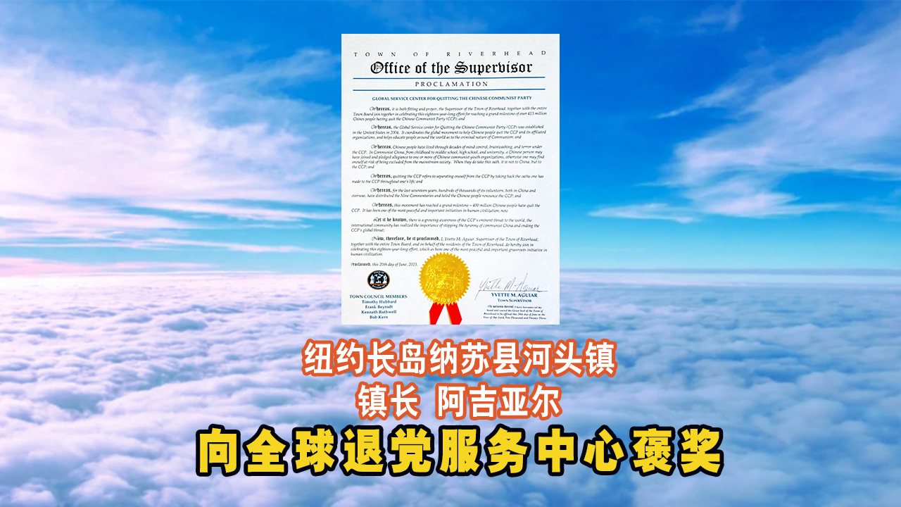 7月1日,被全球.退:党!服务中心定为“退!党!日”,此前美国多位民选官员向中心发出褒奖令和贺信,表示全世界已认识到中共的威胁,并祝贺近4.15亿中国人退出中共党团队组织。 长岛苏福克县河头镇(Town of Riverhead)镇长阿吉亚尔(Yoette M. Aguiar)偕镇委员会向全球.退:党!服务中心发来