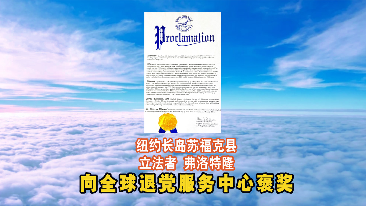 近日,纽约长岛苏福克县第11区立法者弗洛特隆(Steven J. Flotteron)向全球.退:党!服务中心颁发褒奖,庆祝4.15亿中国人三:退.。 “立法者”是法律人中被称道的 “人类行为工程师” 。史蒂文在褒奖词中指出,中国人在中国共产党统治下经历了几十年的精神控制、洗脑和恐怖。在共产中国,一