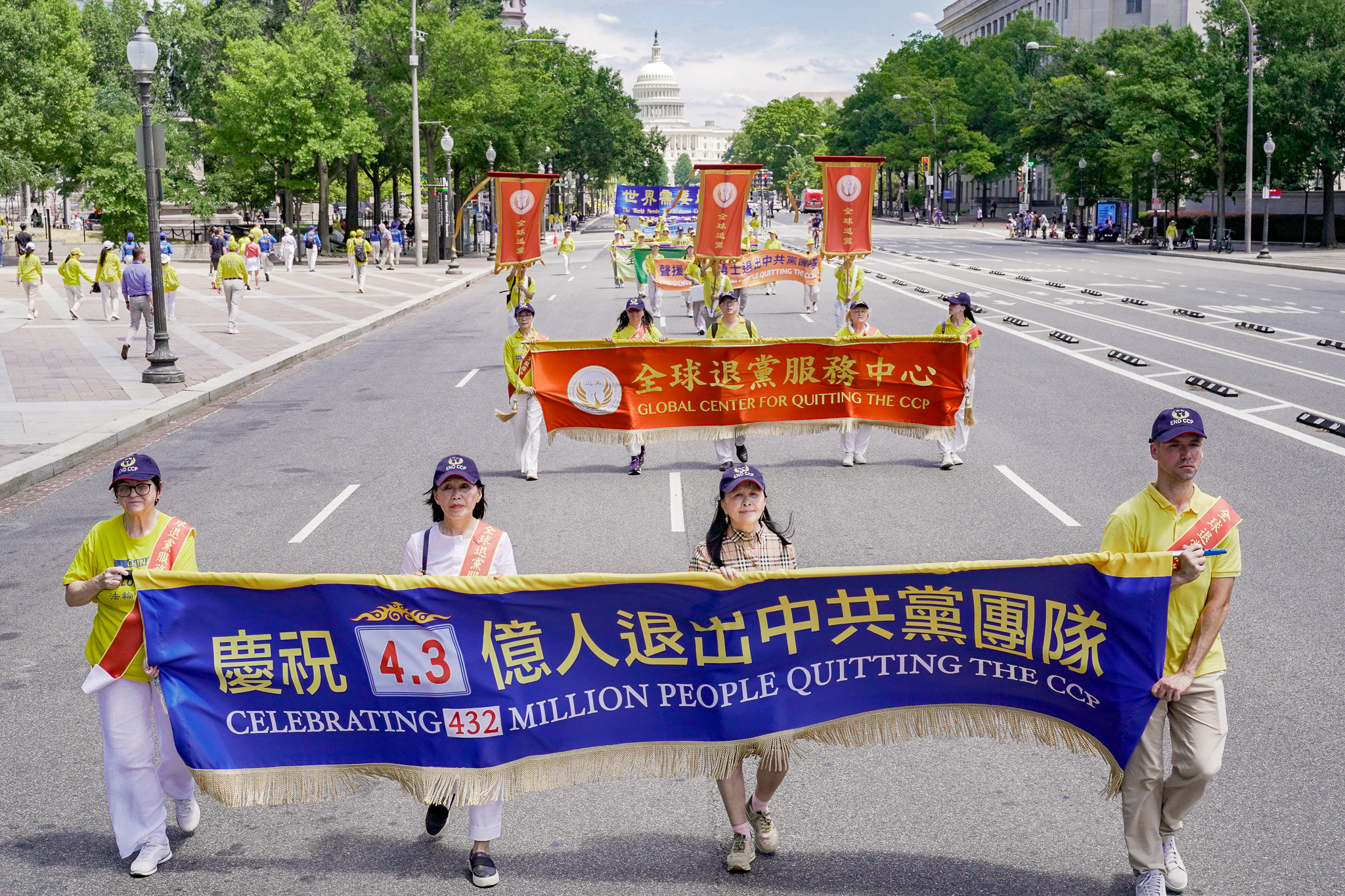 2024年7月11日(周四),来自美国东部地区的数千法轮功学员,在美国首都华盛顿DC举行反迫害25周年大游行,游行从国会大厦前的国家大草坪出发,途经多座美国联邦政府大楼,最后行进至靠近白宫的自由广场。 游行队伍打头阵的是由法轮功学员组成的天国乐团,队伍共分为“法轮大法好”“停止迫害法轮功”及“声援4