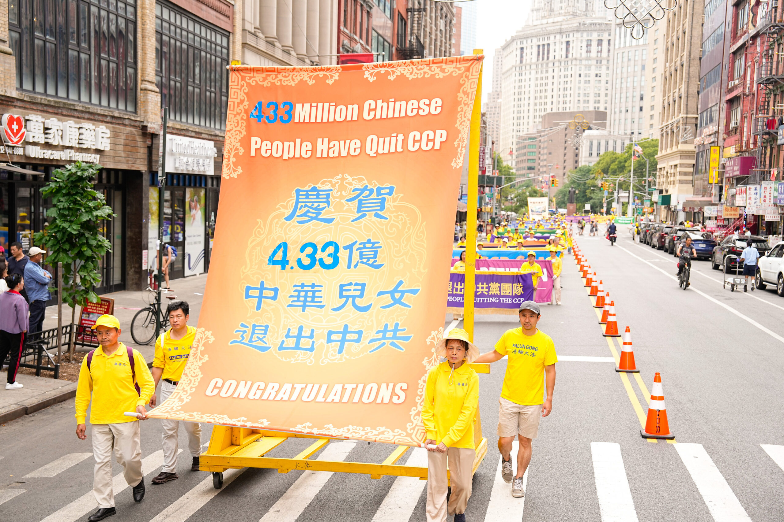 7月20日,纽约约两千法轮功学员在曼哈顿华埠举行盛大游行,呼吁结束中国共产党长达25年的对法轮功修炼者的迫害,并声援4.33亿中国人退出中共党团队组织。沿路受到居民、游客的支持。 法轮功是以“真、善、忍”为原则的佛家身心修炼功法,包括五套优美缓慢的功法动作,祛病健身及提高人的道德水平效果神奇。中共公