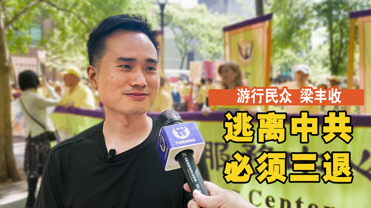 2023年5月12日,纽约曼哈顿市中心锣鼓喧天,一派喜庆热闹,来自大纽约州地区的五千多名法轮功学员在此举行盛大游行,庆祝“5·13世界法轮大法日”暨大法洪传31周年。不少从中共逃离的华人也赶来声援法轮功,梁丰收先生就是其中的一位,在接受记者的采访中,更是呼吁广大的中国朋友去三:退.,去纽约法拉盛的全球退