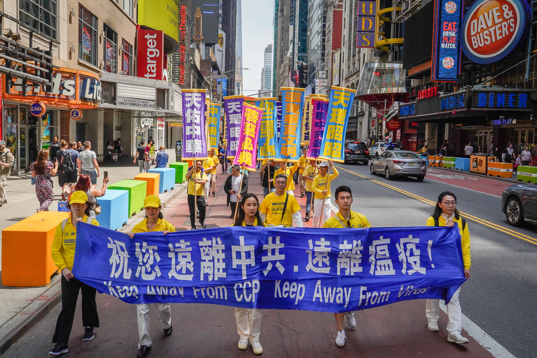 周五(5月12日),大纽约地区五千多位法轮功学员在纽约曼哈顿中心举行盛大游行,庆祝“5·13世界法轮大法日”。本次游行活动的第三方阵,是庆贺全球超过4亿华人退出中共的党、团、队组织的队伍,法轮功学员们持各式横幅揭露中共的邪恶,呼吁民众共同抵制中共的罪恶,早日解体邪恶的中共政权。