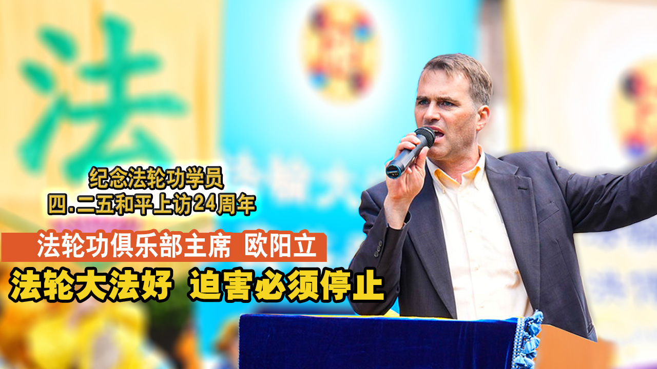 法轮功俱乐部主席欧阳立:“1999年4月25日在中南海外的这次集会,一万名勇敢的法轮功学员,他们与我们今天所做事的和2001年所做的事没有什么区别。默默地,和平地聚集。”法轮大法好,停止迫害”,这就是我们当时要表达的信息也是我们现在要表达的信息。这24、25年,其实很简单,法轮大法好,真善忍好。”