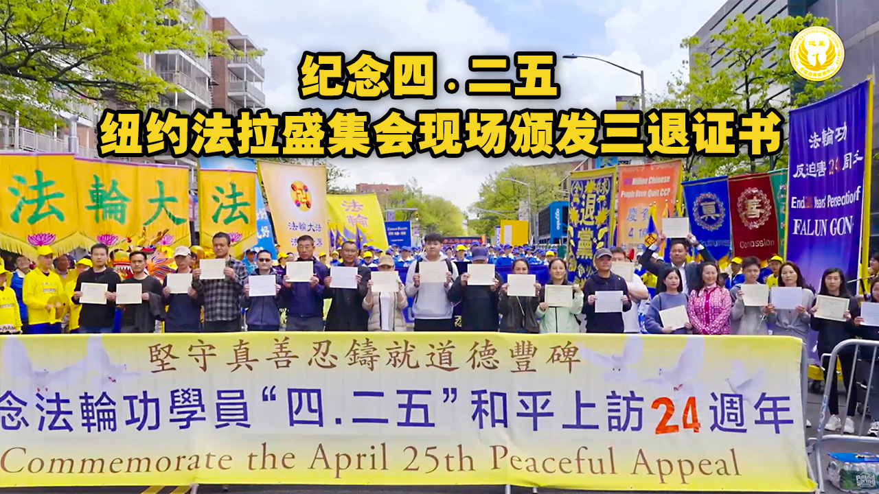 在纪念法轮功4‧25和平上访24周年纽约法拉盛集会现场,全球.退:党!中心主席易蓉向20名退出中共党、团、队的勇士,颁发了三:退.证书,他们是:吴连英、潘航涛、江久林、张可泉、田康宁、刘永弟、钟圣平、陈孝存、王亮、马玉风、林虹、郑振朋、杜清峰、谢海云、高玮廷、董航、梁丰收、高峰、陈全红、韩玉正。 在纪念4.2